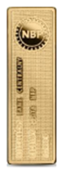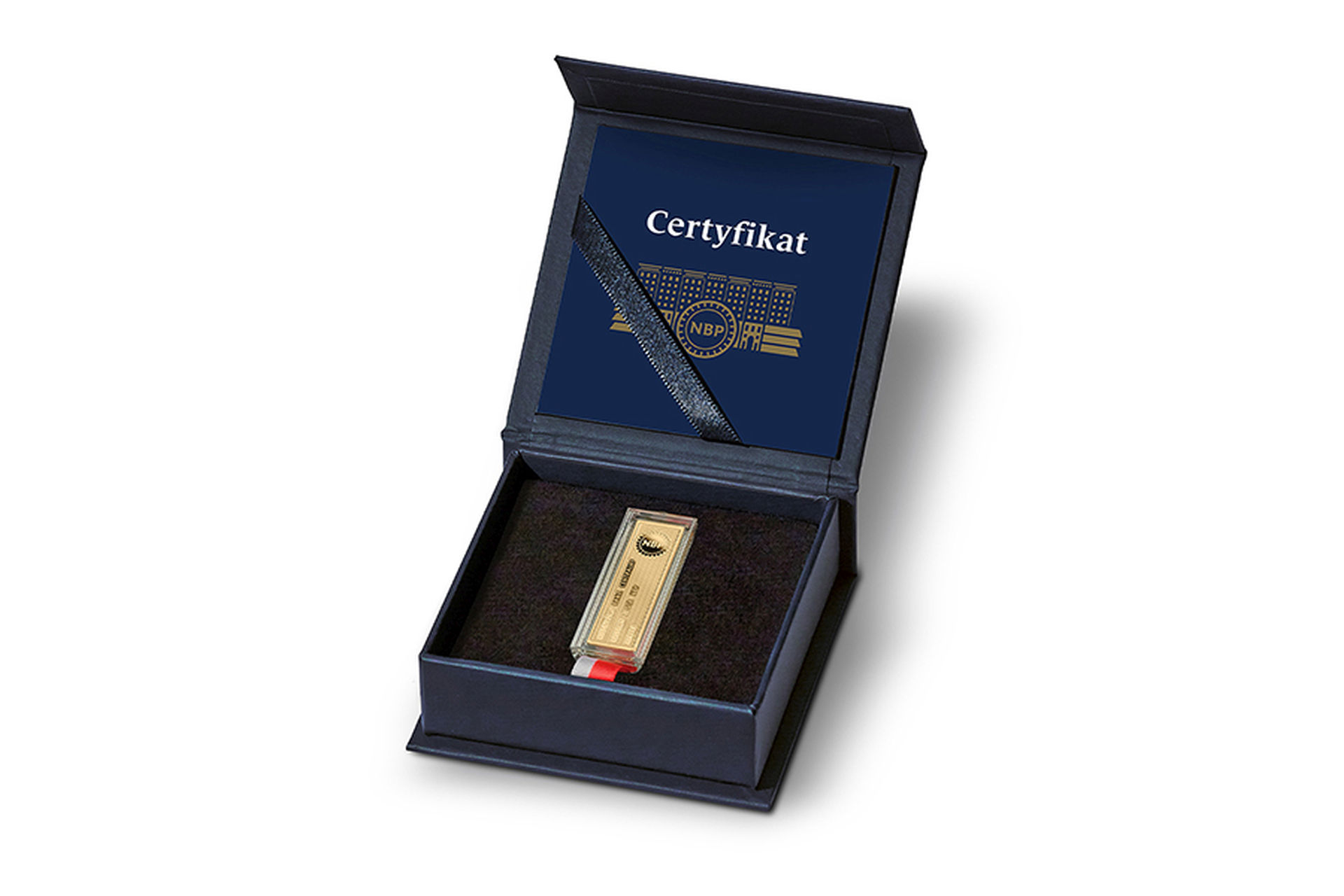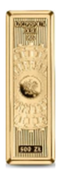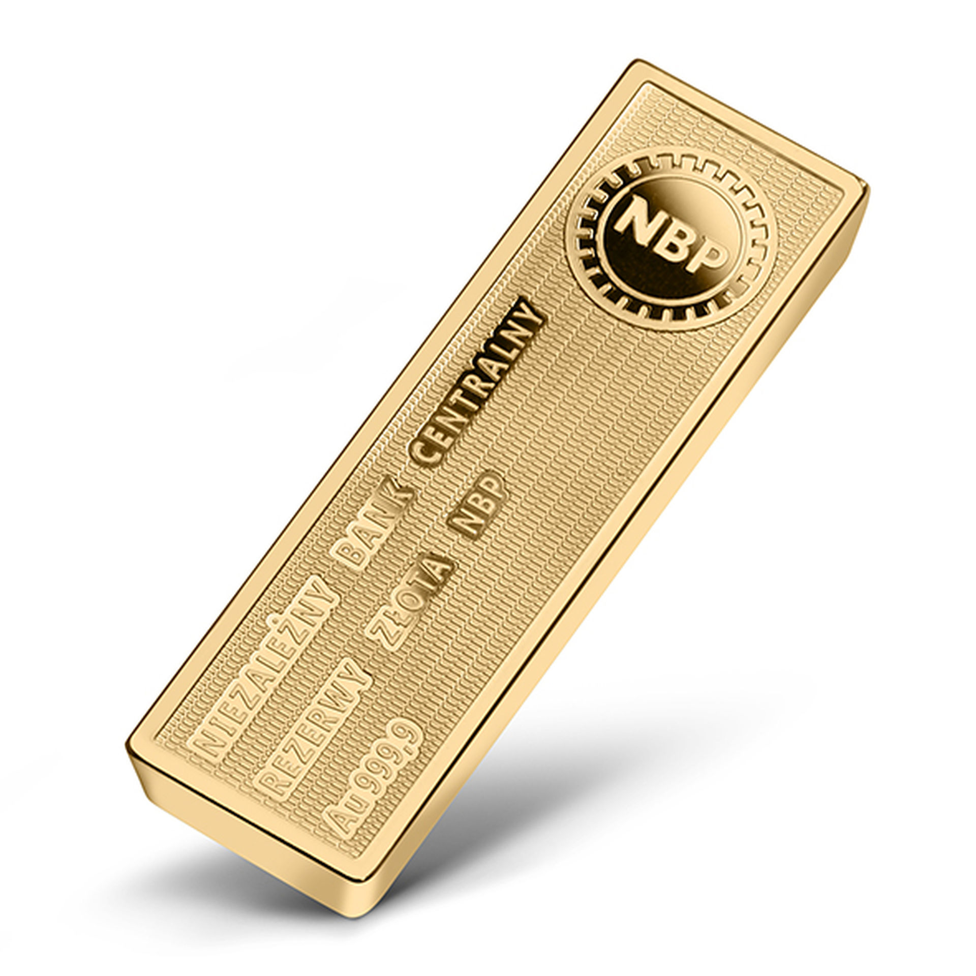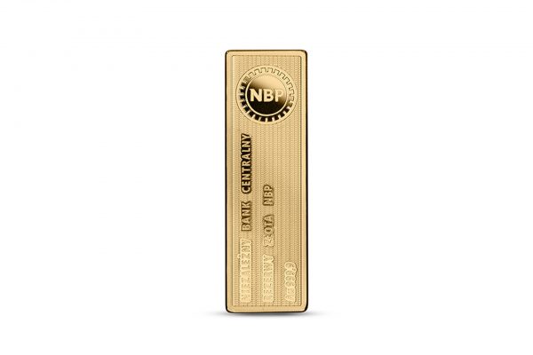 u góry znak graficzny Narodowego Banku Polskiego, poniżej, pionowo, ułożony z liter pod kątem 90° napis: NIEZALEŻNY BANK CENTRALNY / REZERWY ZŁOTA NBP / Au 999,9.