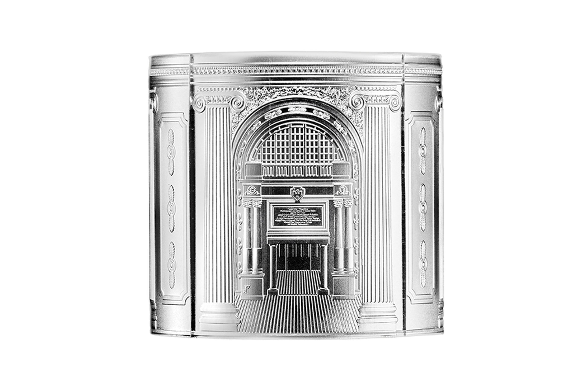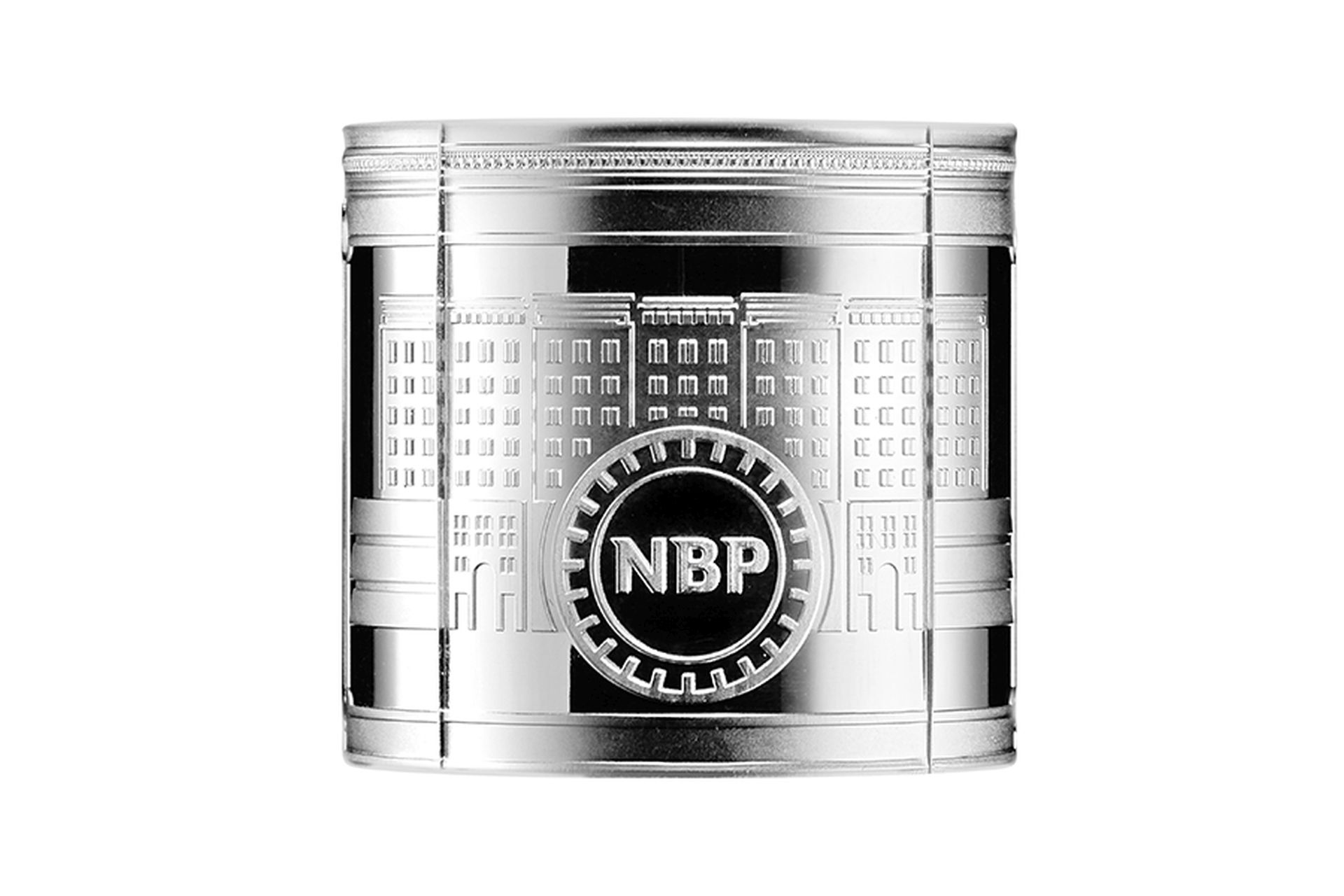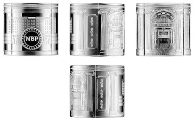 element graficzny przedstawiający siedzibę Narodowego Banku Polskiego przy ulicy Świętokrzyskiej w Warszawie zawierający znak graficzny Narodowego Banku Polskiego oraz wizerunek wejścia do głównej sali operacyjnej dawnego budynku Banku Polskiego SA przy ulicy Bielańskiej w Warszawie. Po bokach wizerunków siedziby i wejścia kolumny, pomiędzy kolumnami element dekoracyjny.
