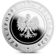 centralnie wizerunek orła ustalony dla godła Rzeczypospolitej Polskiej otoczony dwoma okręgami. W otoku od lewej strony ku górze napis: RZECZPOSPOLITA POLSKA 2026, u dołu perełka.